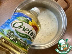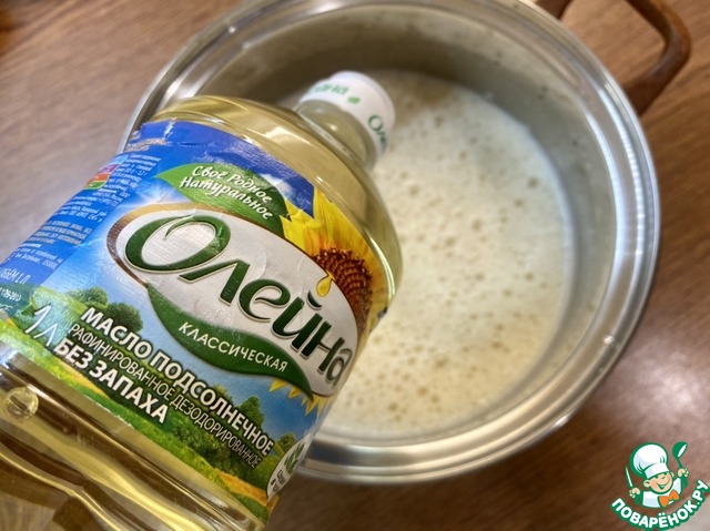 Добавить в тесто подсолнечное масло (ТМ Олейна классическая), размешать венчиком.