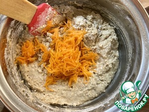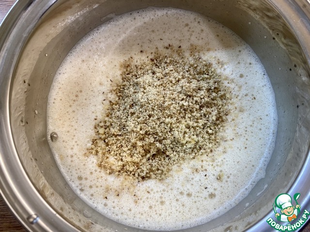 Добавить измельчённые в крошку грецкие орехи и разрыхлитель, размешать.