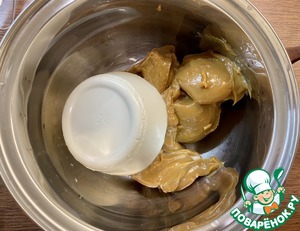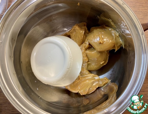 Смешать вареное сгущённое молоко и рикотту, взбить миксером.