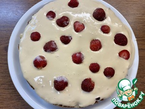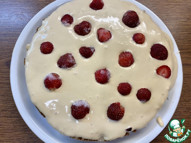Положить первый коржик на тарелку, полить пропиткой (вода+варенье) для мягкости. Выложить 1/3 крема и разложить ягоды.