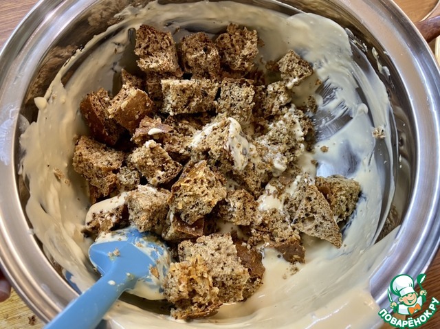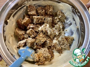 В оставшийся крем положить разрезанную на небольшие кубики верхушку торта и перемешать.