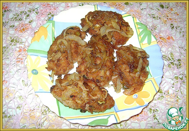 Готовые котлеты выложить на тарелку, сверху жаренный лук.