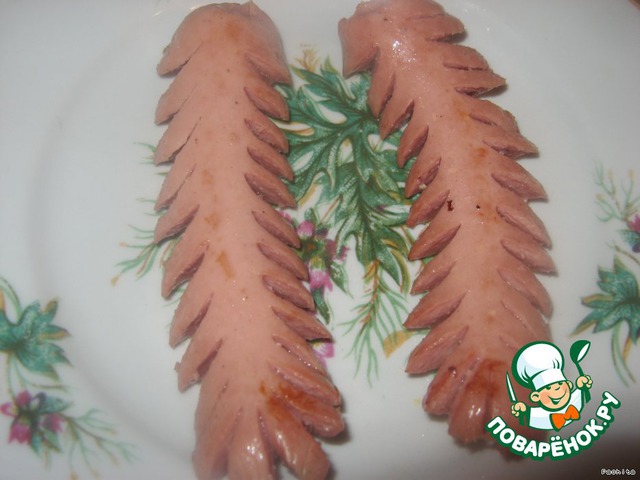 Сосиску разрезать вдоль на две половинки. Сделать надрезы, как показано на фото.