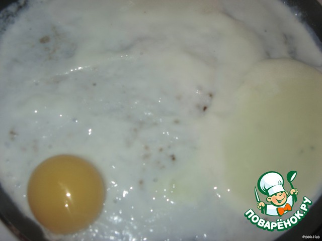 Белки взбить с солью, вылить на раскаленную сковороду. С одного края аккуратно кладём желток, чтоб не потёк.