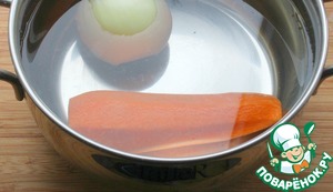 В кастрюлю наливаем воду, выкладываем морковь и 1 луковицу, ставим на огонь, доводим до кипения.