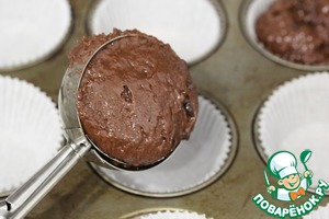 Разложить тесто по формам для маффинов. Удобно делать это ложкой для мороженого.