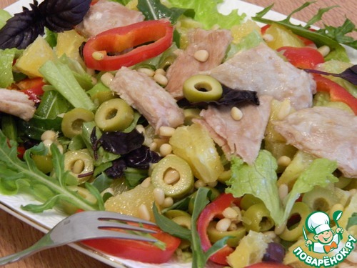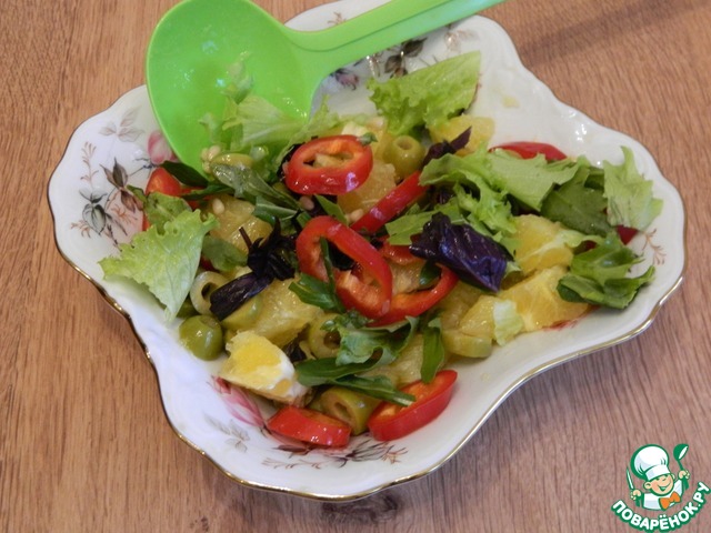 Этот шаг Вы можете пропустить. В самый последний момент я добавила ложечку облепихи, так как мой муж, очень любит эту ягоду. Я решила сделать ему приятное. Облепиха придает кисловатый и пикантный привкус салату. Апельсин, перец болгарский придаст сочности, оливки солноватый вкус, (соль я не добавляла, мне достаточно ), салатный микс свежести, мясо сытости, орешки ореховый привкус.