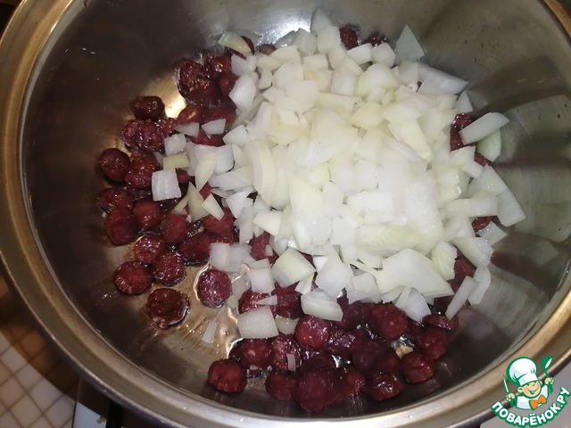 Лук нарезать кубиками. Высыпать к колбасками. Обжарить 4-5 минут.