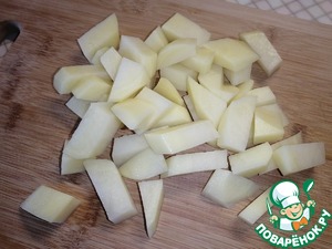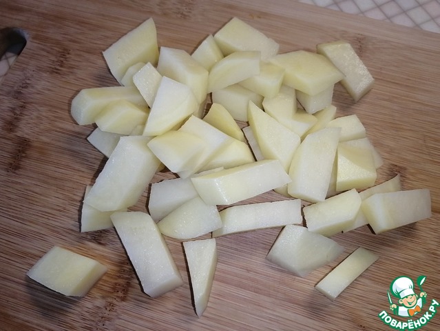 Добавить в кастрюлю крупно нарезанный картофель и всыпать рис. Варить 10-15 минут.