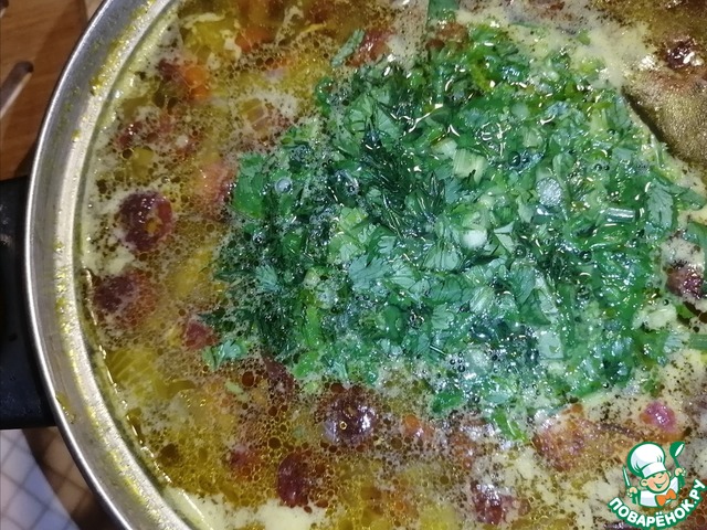 Добавляем крупно порезанную зелень. Ещё варить 10 минут. Готово.