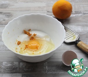 В другую чашку всыпать сахар, натереть апельсиновую цедру, вбить яйца