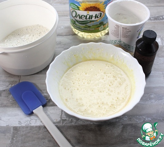 Постепенно, в 2-3 приема ввести муку, йогурт, ванильный экстракт или ванилин, хорошо перемешать обе смеси. -