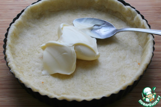 На тесто выкладываем ровным слоем мягкий плавленный сыр.