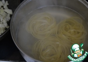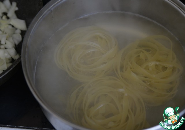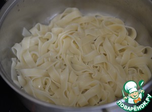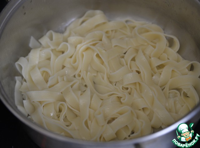 Одновременно ставим варить пасту. Варим, согласно инструкции на упаковке, у меня тальятелле. Варим до состояния аль-денте (у меня 8 минут).