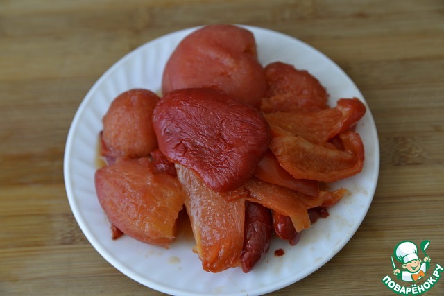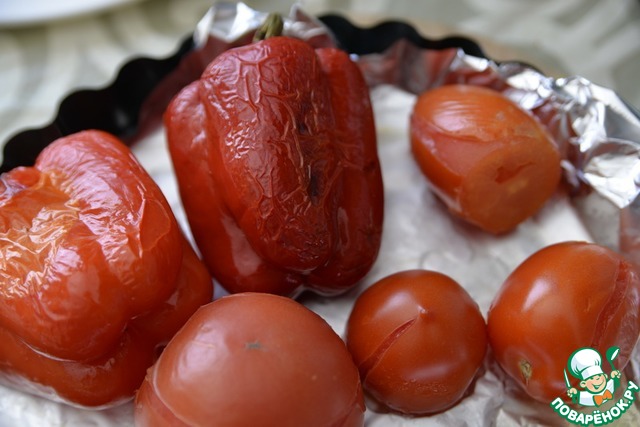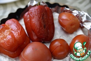 Через 15 минут, кладём к перцам помидоры, запекаем всё ещё 15 минут. Достаём запечённые овощи из духовки. Они должны быть мягкими, с подпалинами. Накрываем фольгой, оставляем на 15 минут.