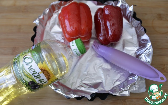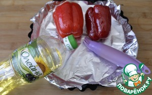 Перец моем, прокалываем зубочисткой, смазываем маслом, у меня "Олейна", подсолнечное с добавлением оливкового, кладём в форму покрытую фольгой, ставим в духовку на 200 градусов на 15 минут.