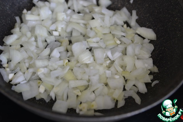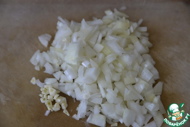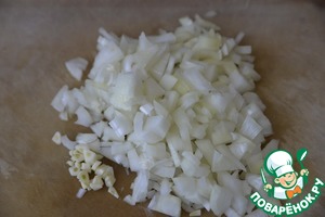 Чистим лук и чеснок, лук режем кубиками, измельчаем чеснок.
