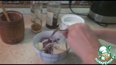 Сначала замаринуем лук, нарежем его полукольцами, добавим сахар, соль, уксус, хорошо перемешаем. Немного утрамбуем ложкой, накроем сверху тарелкой и оставим мариноваться.