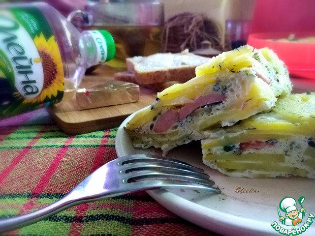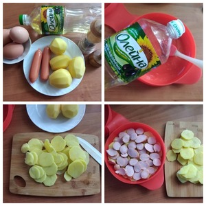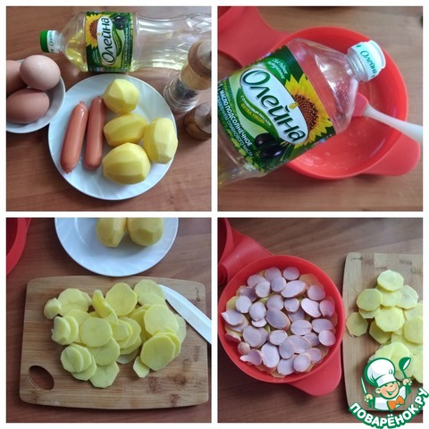Для приготовления омлета нам понадобится посуда для СВЧ с крышкой. У кого есть СВЧ, то и посуда найдётся. Это может быть даже стеклянная кастрюля с крышкой. ВАЖНО, чтобы крышка была! и не колпак для СВЧ! У меня есть силиконовая, именно для приготовления испанского омлета. Готовим продукты для омлета. Сосиски добавлять в омлет необязательно, но с ними вкусней. Если вы решите добавить колбасные изделия, то можно взять любую колбасу. Картофель чистим, моем, обсушиваем бумажным полотенцем и нарезаем очень тонкими слайсами (см. фото). Сосиски режем произвольно. Посуду обмазываем кисточкой с маслом. Испанский омлет делается на оливковом масле. Я сегодня буду использовать масло ТМ Олейна подсолнечное с добавлением оливкового. На низ выкладываем половину нарезанного картофеля. На него-сосиски.