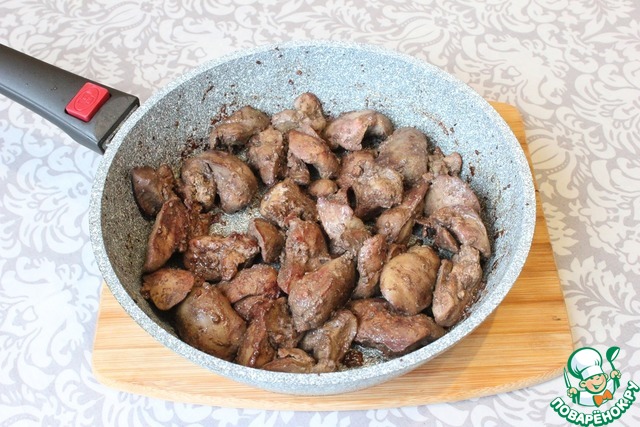 Обжариваю печень на сковороде с добавлением подсолнечного масла. Добавляю немного соли (с учётом того, что соль также будет добавляться в заливку).