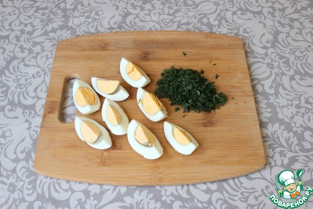 Вареные яйца чищу и режу каждое яйцо на 4 части.