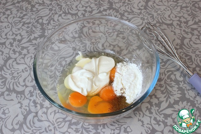 В глубокую миску разбиваю 4 сырых яйца. Добавляю сметану, крахмал, черный молотый перец. Солю заливку по вкусу.