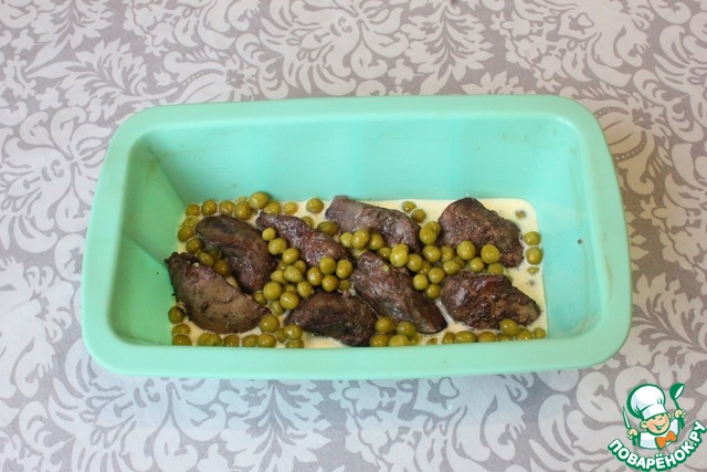 На дно вливаю 5-6 ложек заливки. Выкладываю половину кусочков печени. Посыпаю половиной зелёного горошка. -