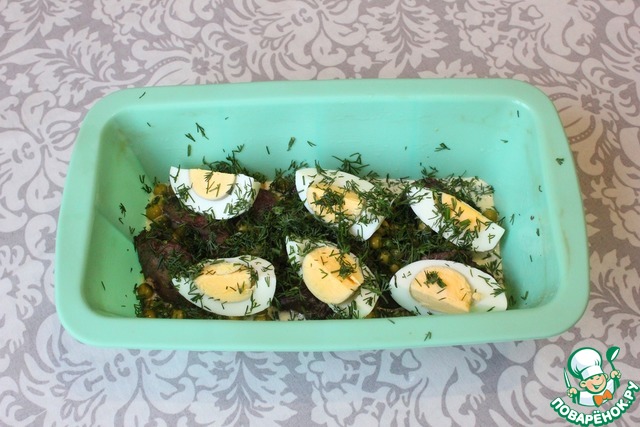 Дальше укладываю половину варёных яиц и посыпаю половиной укропа.