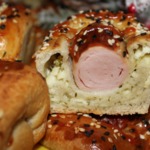 Каждый рулетик уложить в форму для запекания швом вверх, сверху уложить сосиски. Накрыть салфеткой и оставить минут на 15 в теплом месте.