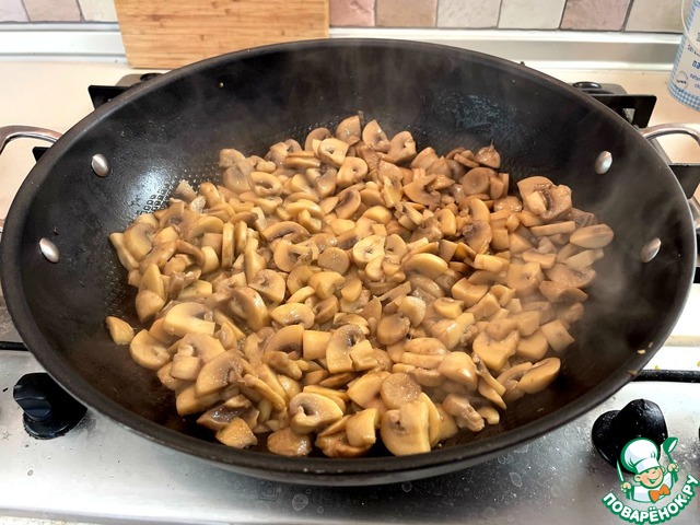 Шампиньоны нарезать пластинками толщиной 3-4 мм и слегка обжарить в сковороде (у меня вок) на растительном масле. У меня тут был 1 кг грибов, но после обжарки я отобрал половину как заготовку на будущее.