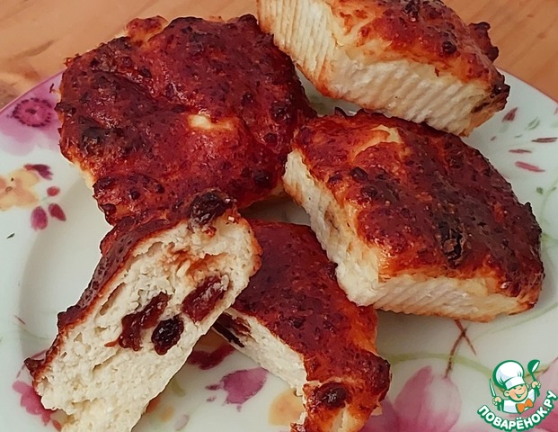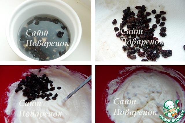 Изюм залить горячей водой на 5мин., затем воду слить. Изюм просушить бумажным полотенцем. Добавить изюм в творог, перемешать.
