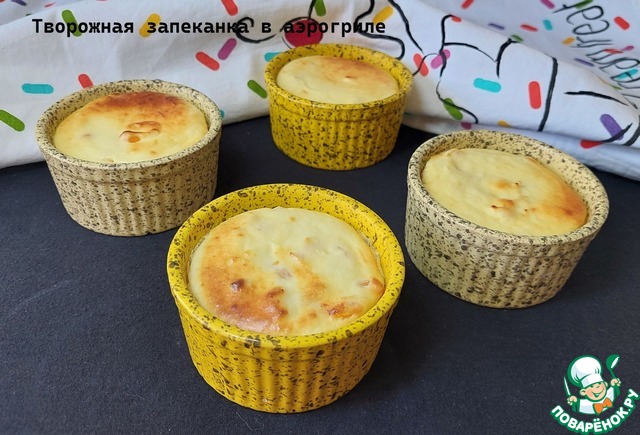 Керамические формочки для выпечки смазать маслом, заполнить творожной массой. Выпекать в аэрогриле на нижней решетке при 160С 20мин. Готовую запеканку оставить в отключенном аэрогриле под крышкой еще на 10мин.