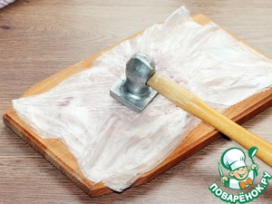 2. Кладем поочередно пластины мяса в прозрачный пакет и отбиваем молоточком с двух сторон.