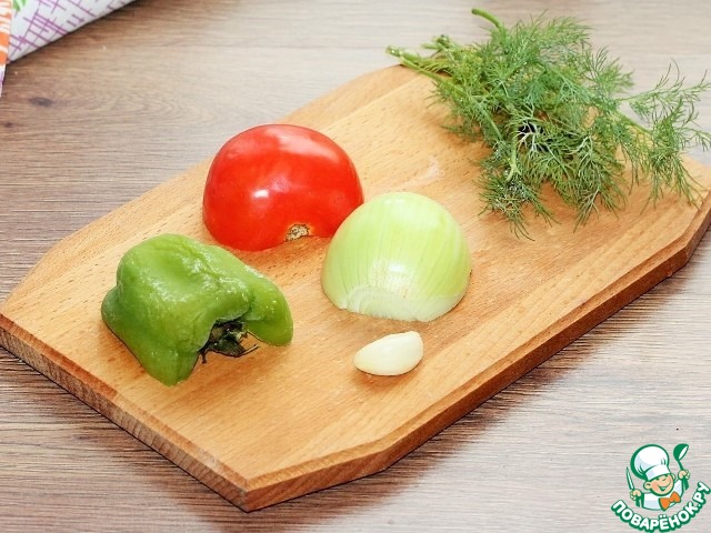 4. Подготовим овощи для начинки; очищаем от шелухи чеснок (1 зуб) и лук (0,5 шт) у помидора удаляем мякоть, у перца семена.