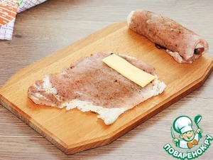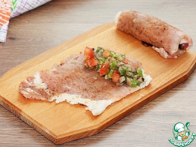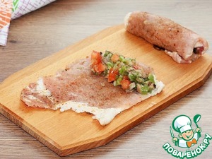 9. Затем кладем начинку и сворачиваем отбивную в рулет.