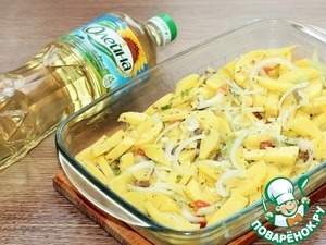 11. Очищенный и порезанный брусочками картофель, выкладываем в форму для запекания. Добавляем порезанный полукольцами лук (0,5 шт), порубленный укроп (0,5 пуч.) и чеснок (1 зуб.), 3 ст. л. подсолнечного масла, лук с грибами и приправу для картофеля (1 ч. л.), солим и перчим. Перемешиваем картофель, так, чтобы он был покрыт маслом.