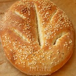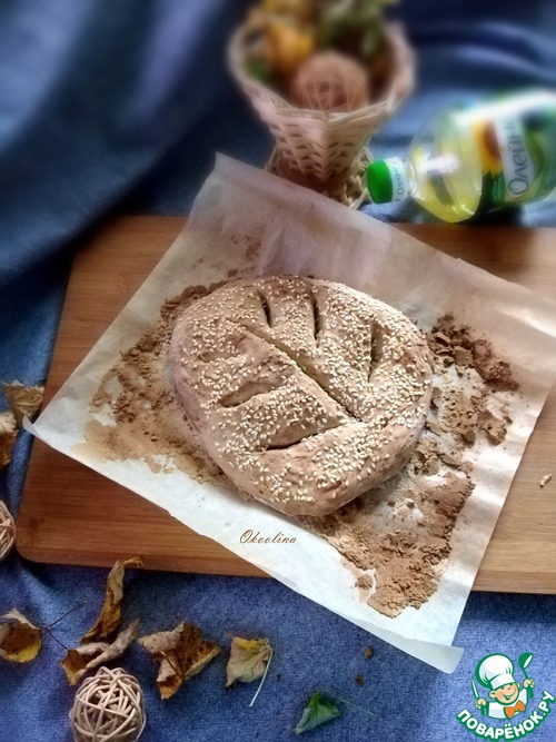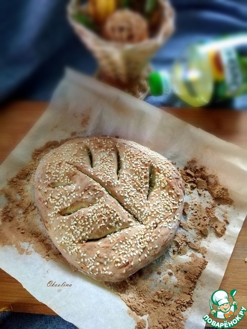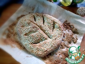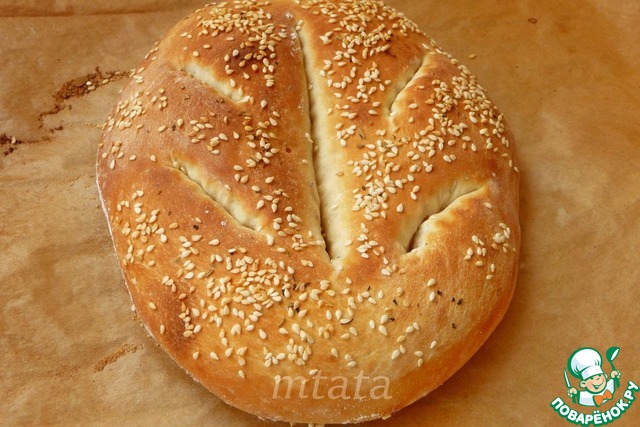 Накрываем и ставим в тёплое место на 1 час. Подошедшее тесто обминаем. Если вы будите делать тесто из полного количества ингредиентов, то поделите его на 2 равные части. Растягиваем тесто в треугольник сначала руками, а затем на пергаменте, хорошо подпыленном мукой. Духовку греем до Т-250 С вместе с пустым протвинем и какой-то небольшой чашкой, куда нальём воду позже. Чашку устанавливаем на самый низ духовки. Пока греется духовка, на тесте делаем прорези. Один посередине и по три с каждой стороны, не дорезая до краёв (см. фото). Обильно посыпаем хлеб кунжутом и быстро отправляем пергамент с хлебом на горячий противень. Наливаем 0,5 стакана горячей воды в посуду, которую грели в духовке, закрываем духовку. Делаем всё быстро! Убавляем немного температуру до 230 С и выпекаем хлеб 15-20 минут.