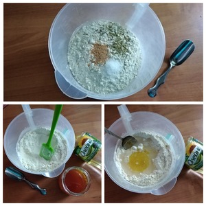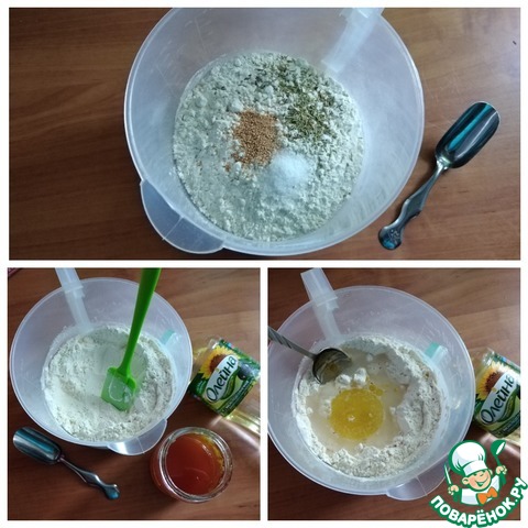 Муку соединяем с солью, дрожжами и розмарином. Добавляем тёплую воду, масло и мёд. -