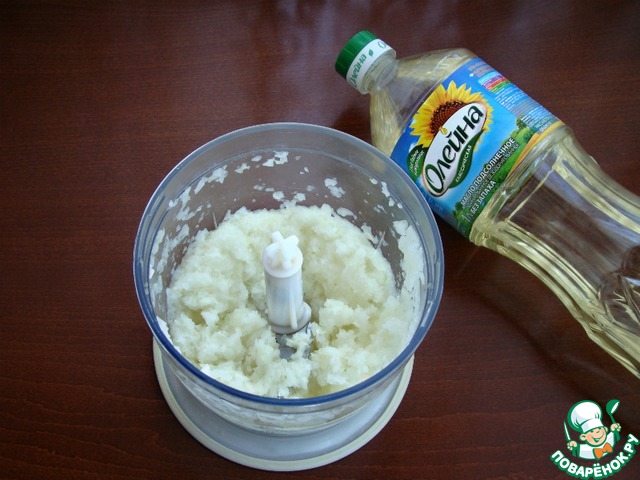 Репчатый лук пропустить через мясорубку или измельчить в блендере.