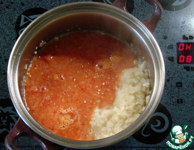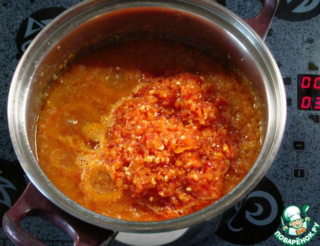 Затем к луку влить томат, пропущенный через мясорубку или измельченный в блендере. Перемешать, довести до кипения и проварить на медленном огне в течение 15-20 минут.