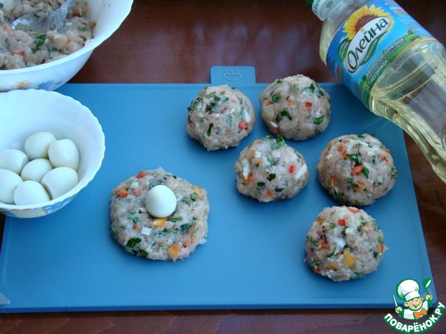 Подготовить начинку для самсы. Для этого из фарша сформировать небольшие колобки, поместив во внутрь перепелиные яйца.