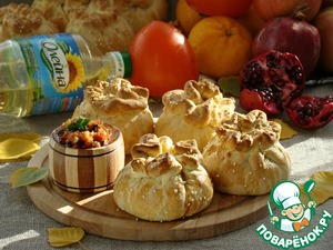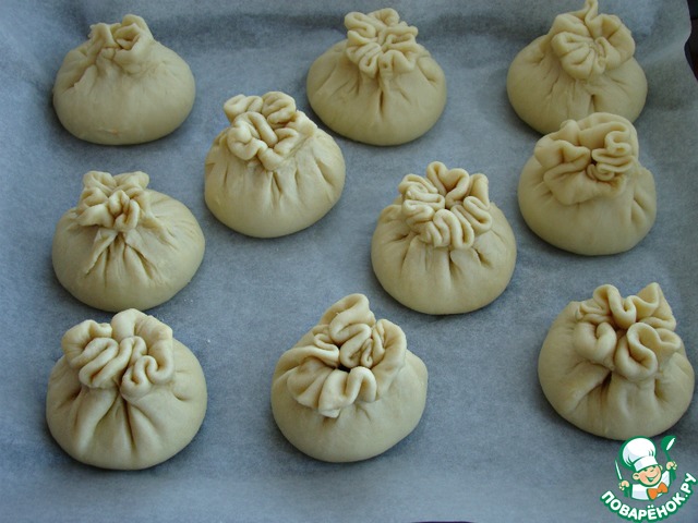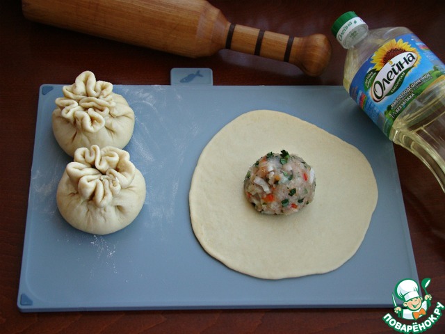 Каждую часть раскатать, положить в середину мясную начинку и свернуть в виде мешочка. -