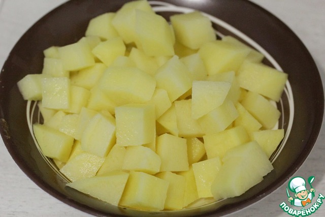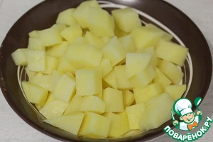 Картофель очистить и нарезать на кубики, одну картофелину оставить целой.