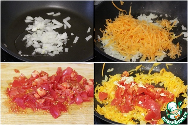 Добавить помидор и чеснок к луку и моркови и потомить пару минут. -