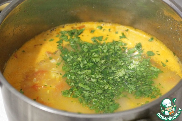 Добавить зелень в суп и снять кастрюлю с огня.