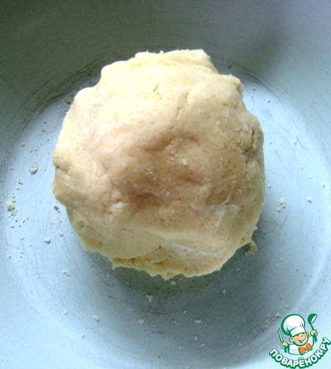 Высыпать в удобную посуду и руками быстро замесить тесто, собирая его в шар.