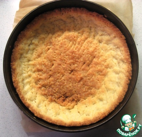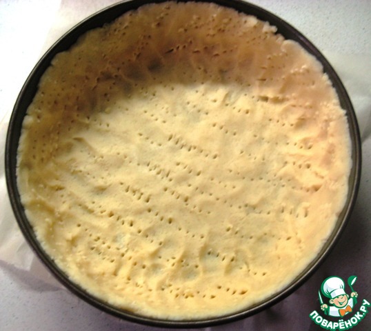 Выложить тесто в форму для выпечки и сформировать дно и высокие бортики (диаметр формы 22 см). Наколоть по всей поверхности вилкой.