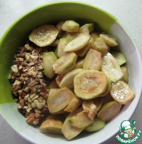Начинка: очистить и разрезать пополам ягоды фейхоа и соединить их с чуть измельченными грецкими орехами. Аккуратно перемешать.