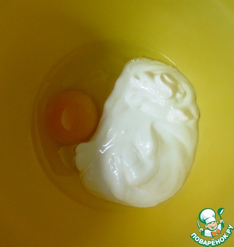 Наливное тесто: в миске соединить сметану и яйца. Перемешать венчиком.
