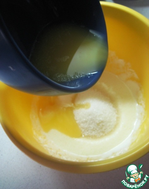 Добавить сахар, влить растопленное и остывшее сливочное масло.